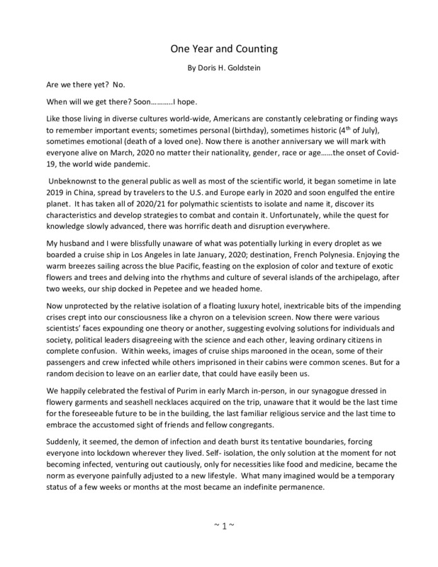 Essay, "One Year and Counting" by Doris H. Goldstein