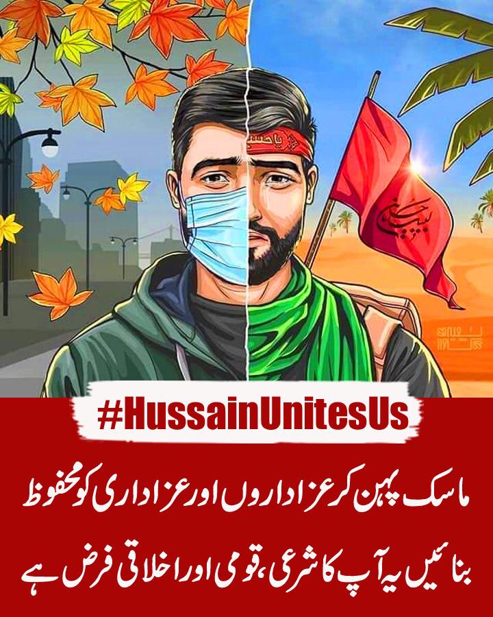 4. Depicting a masked pilgrim wearing a devotional green headband, the image is captioned in Urdu with the words, “Hussain ibn Ali said ‘Any individual who sheds even a single tear for our troubles will be rewarded by Allah with a place in heaven”. Shared widely on social media, the image was often pegged to the hashtags #SaveAzadariSaveAzadar #DefeatCoronaSaveAzadari.